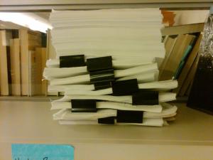 To start the process, each manuscript is “logged in,” which means it’s entered into our database, the cover pages, bios, cover letters, and all other identifying materials detached and filed, and as well the acknowledgment pages, those too, removed and filed.  The manuscripts are numbered consecutively, as received, then put in stacks to be read.